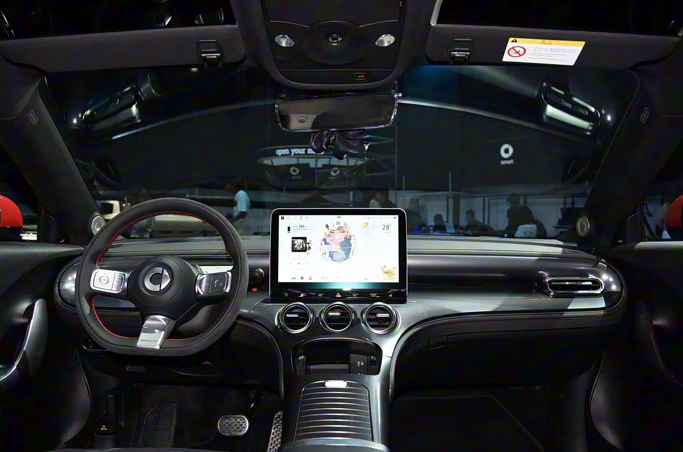 进入车内,smart 精灵 #3 以大量圆形元素打造出兼具科技感与温馨氛围的座舱环境,与梅赛德斯 - 奔驰的豪华设计语言一脉相承。9.2 英寸液晶仪表与 12.8 英寸中控屏组成的双联屏系统悬浮于中控台上,中控屏搭载 “灵感星球” smart OS 全场景数字生态车机系统,内置高通骁龙 8155 芯片,操作流畅度与功能丰富度均处于同级领先水平,支持语音交互、导航联动与手机互联等功能。座椅设计堪称点睛之笔,一体式环抱轿跑座椅采用皮质包覆,头枕上的 smart 标志与行业首创的座椅铆钉设计,彰显新奢运动格调,BRABUS 版本更配备黑红撞色座椅与翻毛皮材质,进一步提升质感。主副驾座椅支持电动调节与加热功能,侧翼的包裹性在激烈驾驶时能提供充足支撑。常规状态下后备箱容积为 370L,放倒后排座椅后可扩展至 1200L,满足日常通勤与短途出游的储物需求。