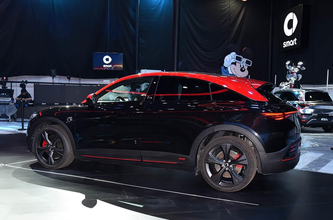 再来看车身侧面部分,作为紧凑型轿跑 SUV,smart 精灵 #3 的车身尺寸为 4400/1844/1556mm,轴距却达到 2785mm,“四轮四角” 的设计理念让短车身与长轴距形成巧妙平衡,完美诠释 “紧凑于外,宽适于内” 的空间哲学。侧面线条是其设计精髓:弓形车顶从 B 柱开始快速下压,形成流畅的溜背曲线,搭配隐藏式电动门把手与无框车门,将风阻系数控制在同级优秀水平擒牛网,同时营造出跑车般的优雅姿态。而普通版本搭载 19 英寸多辐式轮毂,采用低风阻设计以提升续航;BRABUS 性能版则配备全新十辐 Monoblock Z 系列轮圈,还提供 21 英寸 BRABUS “Platinum Edition” 高科技锻造轮圈选装,红色刹车卡钳的加入进一步强化运动属性。